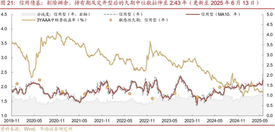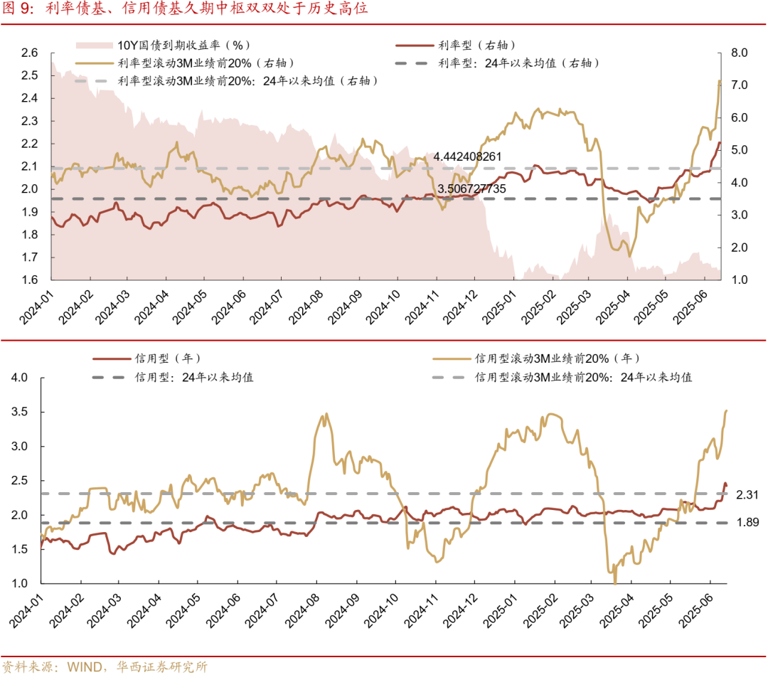6月9-13日,利率震荡下行,基金久期继续拉久期。其中,利率型中长债基久期中枢由前一周的4.67年快速拉伸至5.23年,突破前高;信用型中长债基久期中枢同样拉伸,由前一周的2.17年拉伸至2.43年,创历史最高点。