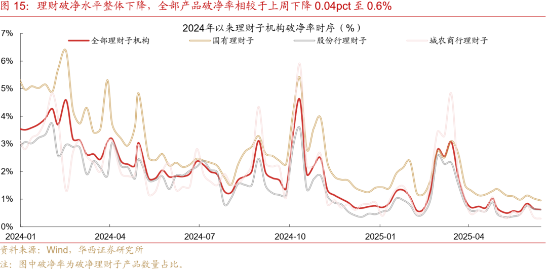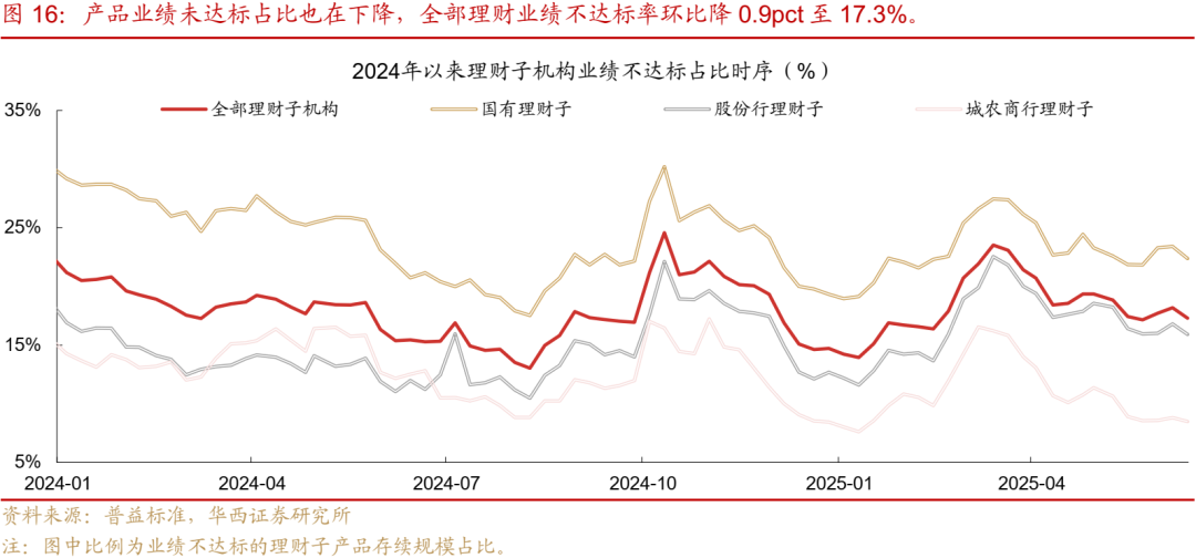同样,产品业绩未达标占比也在下降。全部理财业绩不达标率环比降0.9pct至17.3%。拆分各机构观察,国有行、股份行和城农商行较前一周分别下降1.0pct、0.9pct和0.3pct,分别至22.4%、15.9%和8.5%。