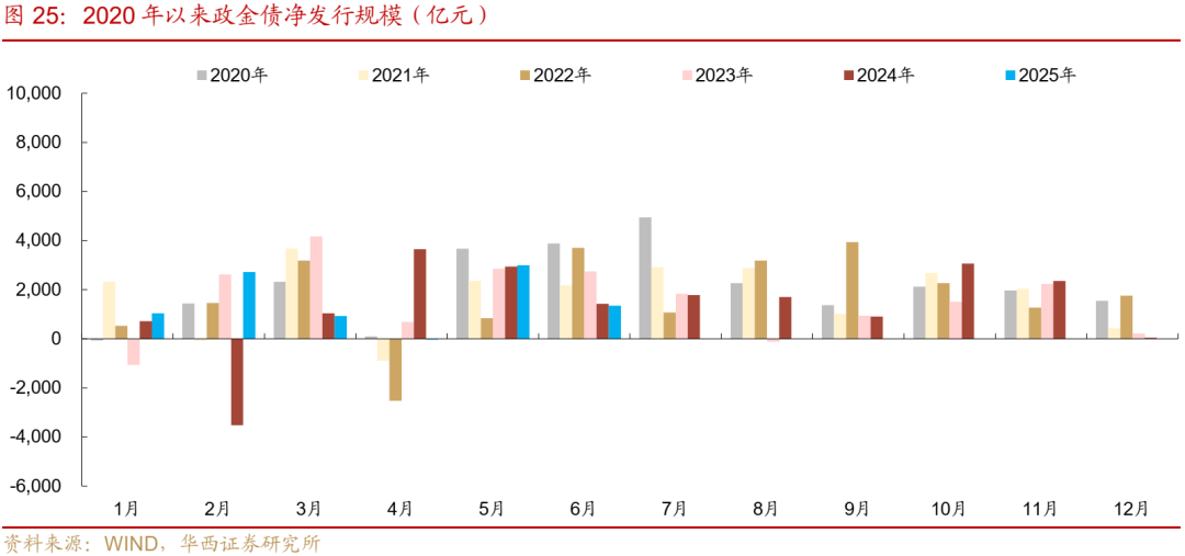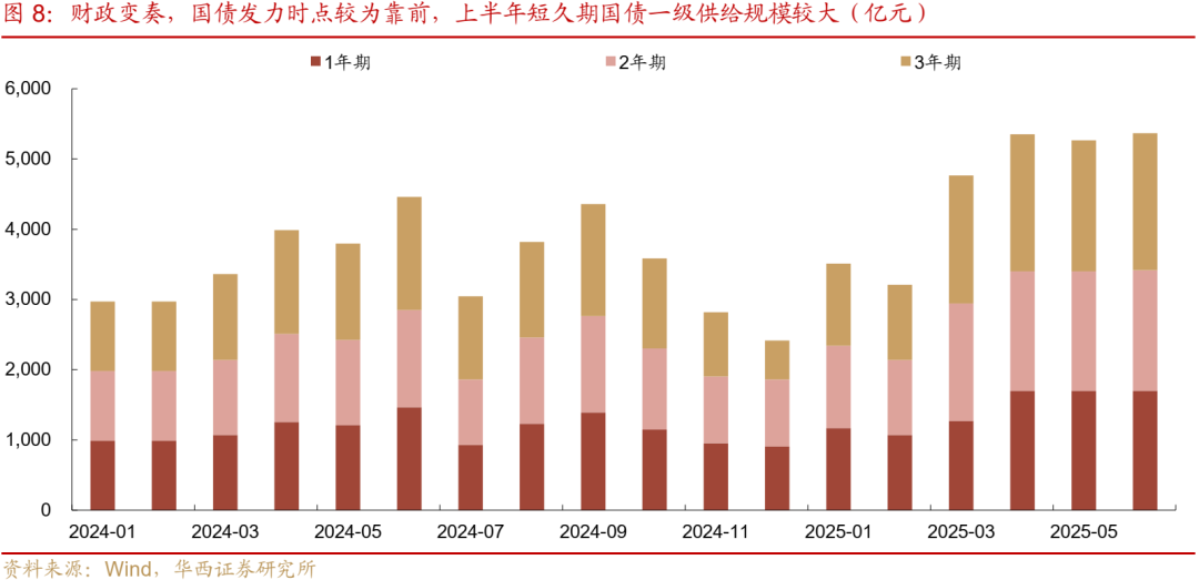 此外,今年债市短端可能还面临一个特殊问题,即财政(国债)发力时点较为靠前。自3月起,1年、2年、3年国债月度发行规模均迅速抬升至1700-1900亿元,远高于2024年11月至2025年2月单月约1000亿元水平。一级市场的充分供给一定程度上缓解了各银行在二级市场“抢券”的诉求。因此,我们也可以发现,尽管5-6月期间,大行恢复了二级市场净买入短久期国债,但并未持续上量。随着下半年债市从供过于求恢复至供需平衡状态,大行在二级市场的买债规模或有所提升,带动利差修复。