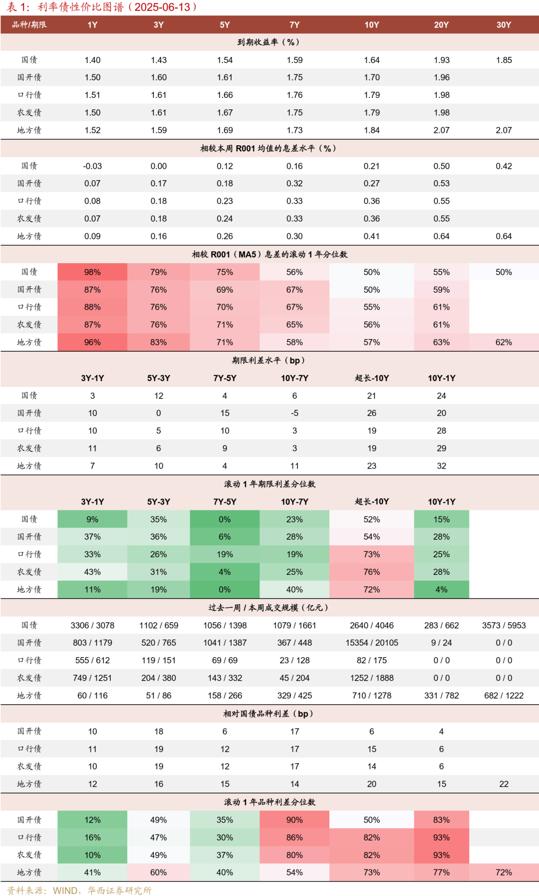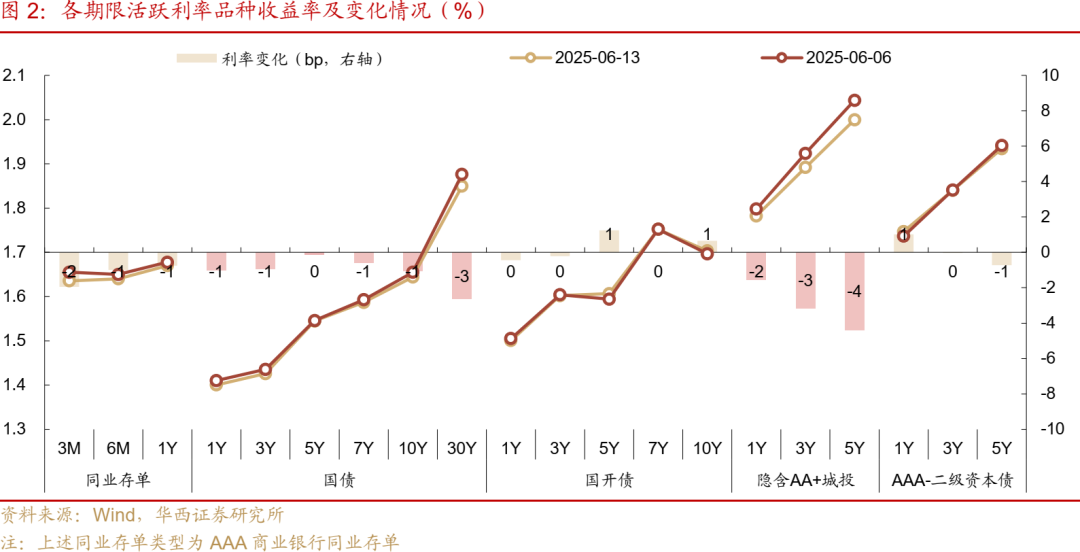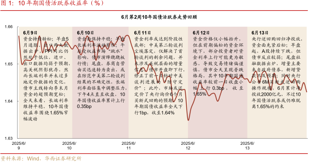 6月9-13日,债市震荡下行,但幅度不算显著。长端方面,10年国债活跃券(250011)下行至1.64%(-1bp),30年国债活跃券(2500002)下行至1.85%(-3bp);短端方面,1年国债活跃券(250008)下行至1.40%(-1bp)%,3年国债活跃券(250005)下行至1.43%(-1bp)。