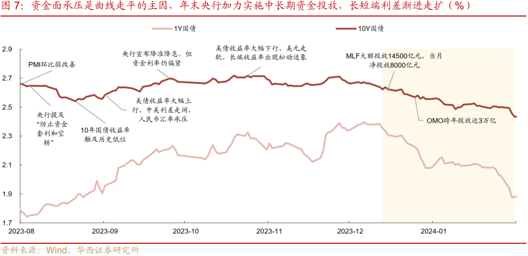 年末央行加大投放中长期资金,长短端利差渐进走扩。2023年12月,随着前期的政府债发行转化为大量的财政投放,且央行公开市场的投放力度较大,其中包括MLF超量续作8000亿、OMO跨年投放近3万亿,资金面开始缓解,短端收益率于年末回落至2.10%附近,利率曲线渐进走陡。