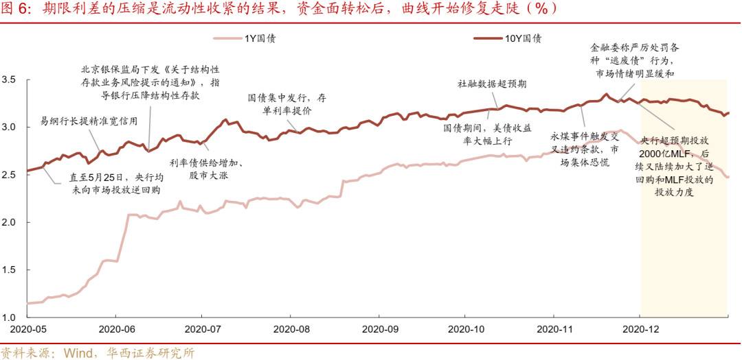 第三轮,2020年期限利差的压缩是流动性极致收紧的结果。2020年4月起至5月25日,央行均未向市场投放逆回购,银行间流动性持续收紧,带动短端利率大幅上行,长短端利差由此开启压缩趋势。6月监管开始指导银行压降结构性存款,银行负债端大幅承压,推动短端利率上行。结构性存款压降的影响一直延续至11月,国债10Y-1Y利差由5月初的147bp压缩至31bp,债市进入长时间的“熊平”行情。