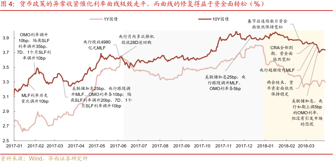 后续曲线形态的修复得益于资金面转松。2017年6月,加息进入中场休息阶段,央行态度软化,开始向市场投放大额MLF,且多次择机投放28D逆回购,资金面紧张情绪有所缓释,10Y-1Y国债利差从倒挂状态回归至8-36bp区间。2018年1月后,在经历了春节、临时准备金动用安排(CRA)到期、两会等诸多不确定性事件后,资金面依旧延续宽松,大大提振了债市的多头情绪,各期限收益率全面下行,长短端国债利差开始修复走扩。