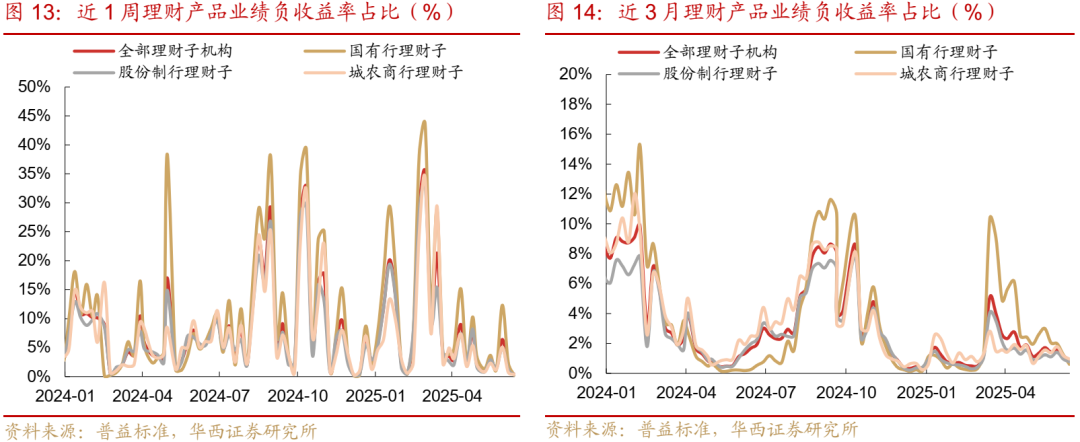 理财破净率和业绩不达标情况易受产品过往业绩影响,2024年以来波动水平相对不大,同过往几轮赎回潮可比性不高,我们更加关注理财区间负收益率表现。