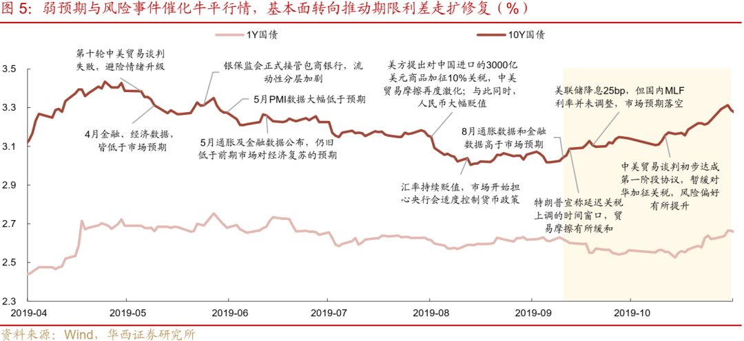 第二轮,2019年弱预期与风险事件下,债市走出“牛平”行情。4-9月,各项基本面数据多低于预期,且中美贸易摩擦不断加剧,推动债牛行情,长端利率一度下行43bp。在此期间,包商银行事件加剧了市场资金面的波动,导致短端利率下行幅度有限,最大下行幅度仅为31bp。在此背景下,长短端利差相应压缩,从此前84bp的高点压缩至40bp。