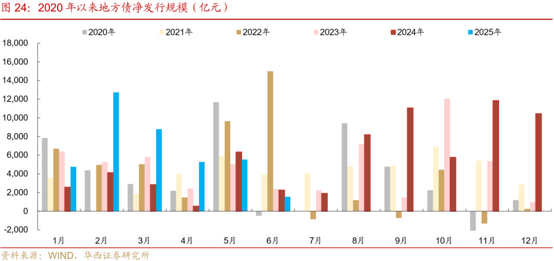 月度来看,6月1-20日,发行地方债4791亿元,净发行1543亿元,其中新增一般债372亿元、新增专项债569亿元(其中:特殊专项债150亿元)、普通再融资债2780亿元、特殊再融资债1071亿元。