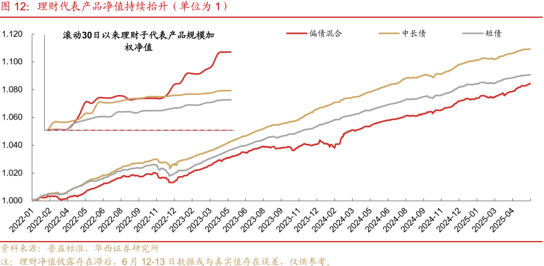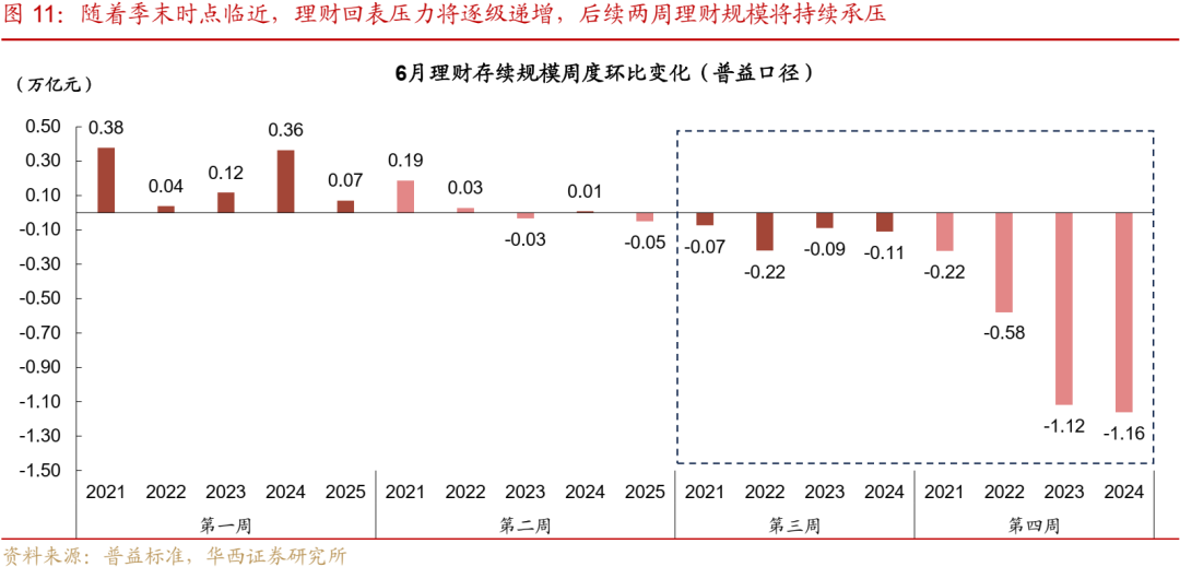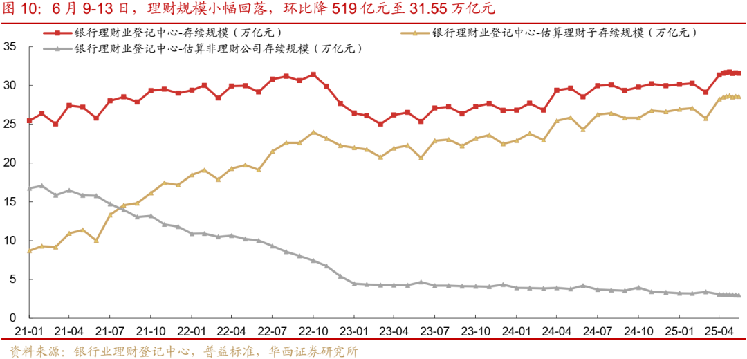 月初首周(6月3-6日)理财规模如期回升,不过增幅相对较小,环比增710亿元(初值为-179亿元)至31.60万亿元。结合历史来看,在季节性资金回流的推动下,历年6月首周理财规模普遍呈上升态势,2021-24年同期周增幅均值为2200亿元,而本次增幅仅高于2022年同期的400亿元,处于历史较低水平。